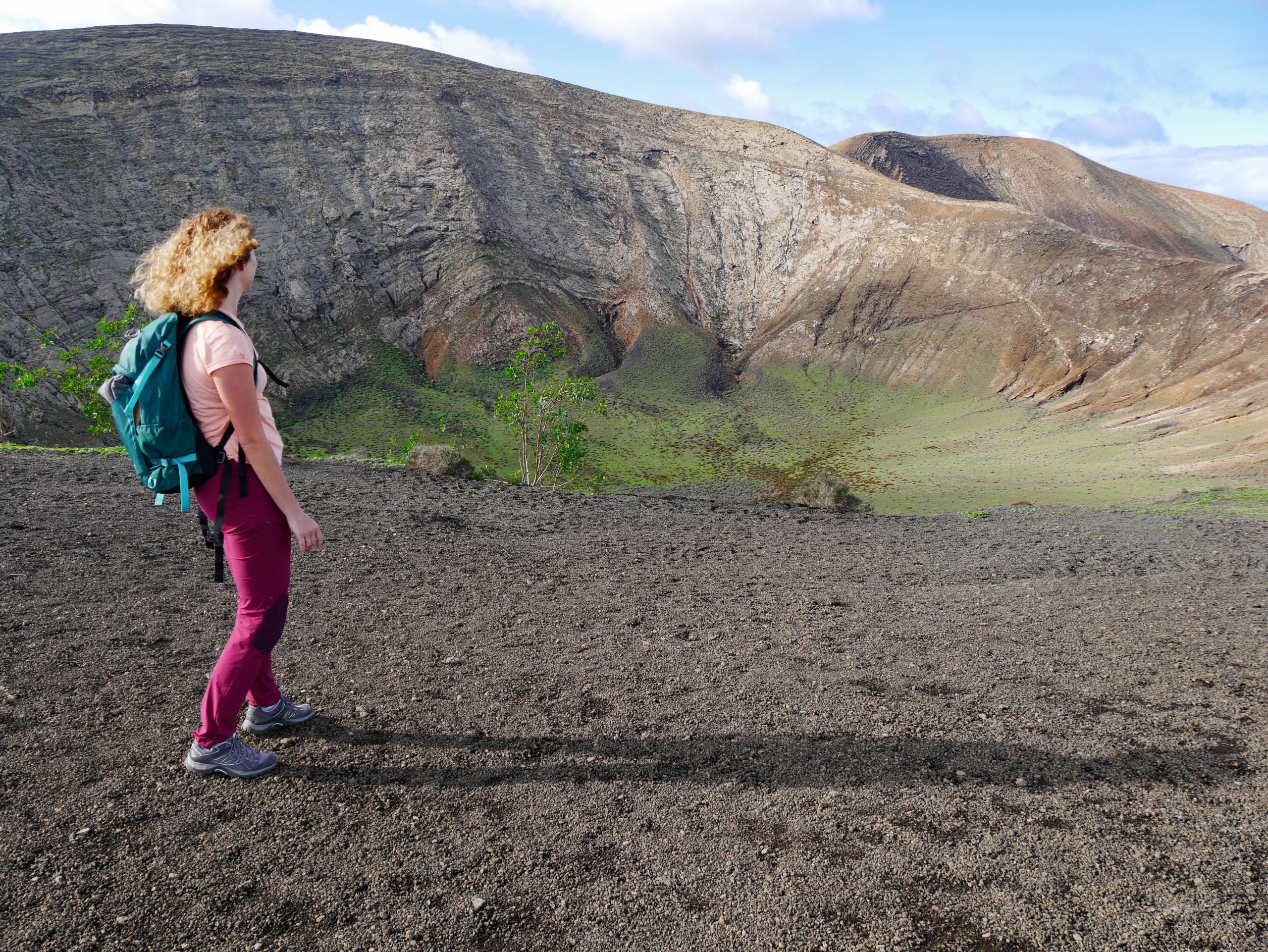 Wariant pośredni – samodzielne wyruszenie na trekking na Caldera Blanca (486 m n.p.m) – i o tym właśnie będzie mowa. Nam niestety nie udało się zarezerwować trekkingu z przewodnikiem, więc jak większość turystów udaliśmy się na zwiedzanie parku busem. To jednak nas nie usatysfakcjonowało na tyle by odpuścić dalsze zwiedzanie. Po krótkim reasearch’u w internecie ruszyliśmy na Calderę Blanca i Wam również to polecamy :). Trekking jest stosunkowo lekki i wymaga jedynie odrobiny kondycji i sportowych butów (tu polecamy trekkingowe ze względu na ostre i nierówne podłoże). Trasa na krawędź krateru i z powrotem zajmuje 2,5 – 3 godziny. Natomiast gdybyście chcieli obejść karter na około czas wyniesie łącznie około 4,5 godziny. Szlak nie jest dobrze oznakowany. Po drodze spotkacie kilka tablic informacyjnych z opisem geologicznym. Droga jest wydeptana i dostępna w kilku wariantach. Wszystkie prowadzą do tego samego miejsca na kraterze. Droga wokół krateru jest momentami wąska, dlatego nie polecam wybierać się tam z dziećmi. Potrafi też mocniej powiać wiatr, dlatego spakujcie na wszelki wypadek bluzę lub kurtkę. Sam widok na kalderę z góry krateru jest hipnotyzujący. Średnica kaldery to około 1 km i jest ona największa na wyspie. Trasa na krater jest również fascynująca i wiedzie poprzez skały magmowe, które powstały na skutek erupcji wulkanów. Broszurka informacyjna z mapą do pobrania tutaj – klik